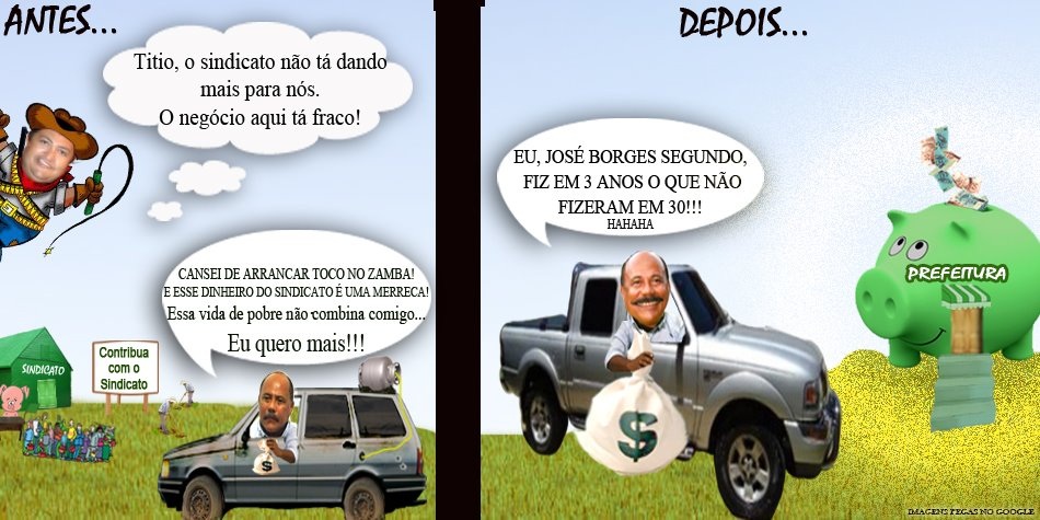 O Blog Campestre Cidadão informou que esta semana foi compartilhada por centenas e centenas de internautas pelo facebook uma charge do prefeito de São José do Campestre, que supostamente pela gravura figuraria um antes e o depois do mesmo ter sido eleito a prefeito da cidade. Tratando-se de alguma brincadeira de algum internauta talvez, o certo mesmo é que se espalhou pela rede social ocupando por mais de uma semana umas das charges mais disseminadas da rede facebook. infoumou o Blog Campestre Cidadão.